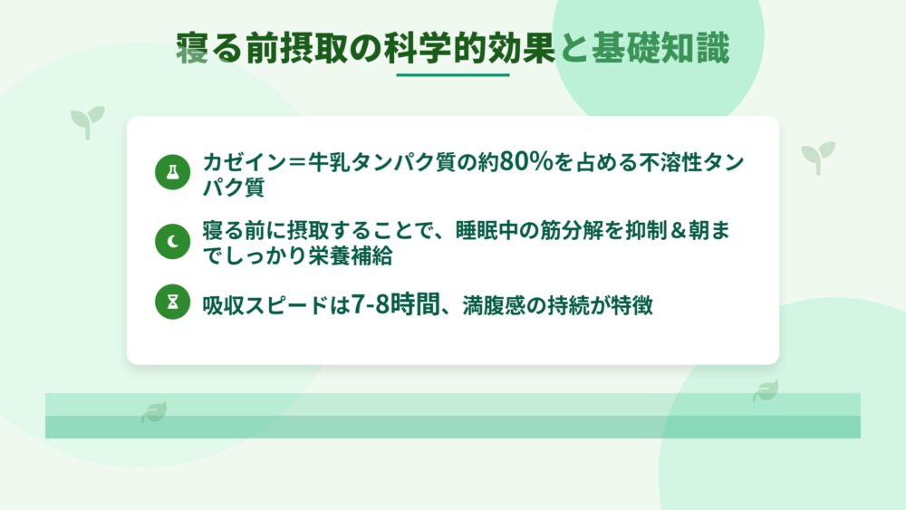 なぜカゼインプロテインが効果的なのか、科学的根拠に基づく3つの理由があります: