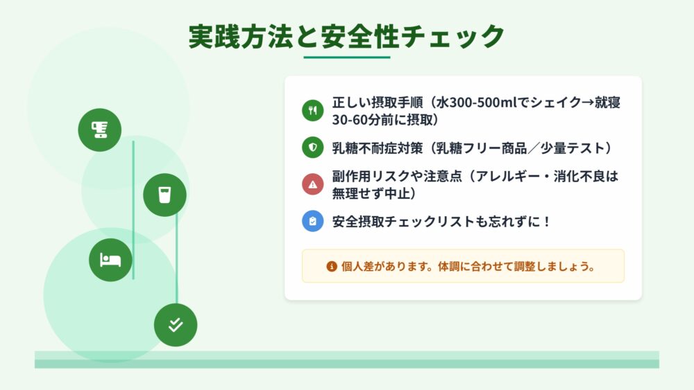 カゼインプロテインの実践方法について、寝る前摂取や乳糖不耐症対策も含めて具体的に説明しますね。私が実際に試行錯誤して見つけた、最も安全で効果的な方法をお伝えします。