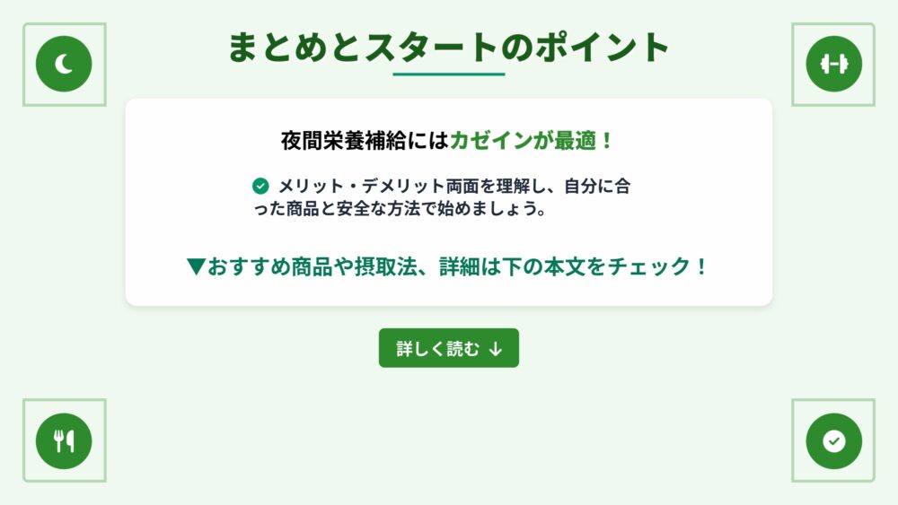 【結論】カゼインプロテインは7-8時間持続する夜間栄養補給専用プロテインです。