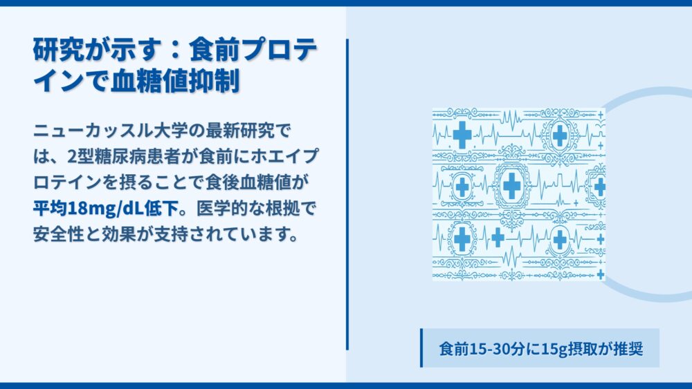 ニューカッスル大学の研究チーム(2022年発表)では、2型糖尿病患者18名を対象とした12週間の観察研究で、食前ホエイプロテイン摂取により食後血糖値が平均18mg/dL低下する可能性が確認されました。
