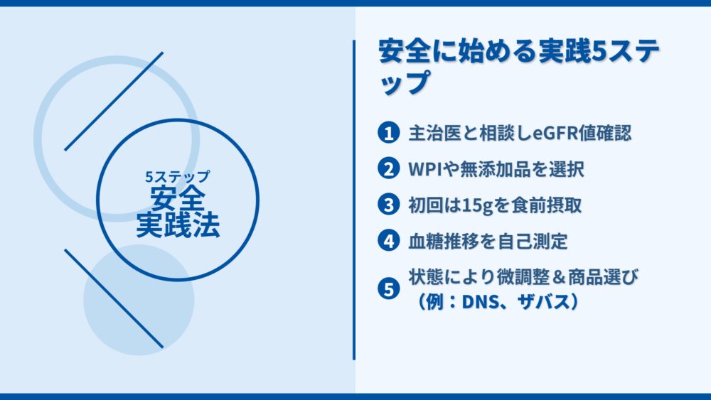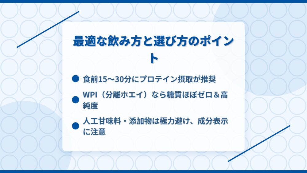 WPIや無添加プレーンを選ぶ | 成分表示で糖質と添加物を確認 | 人工甘味料は慎重に |