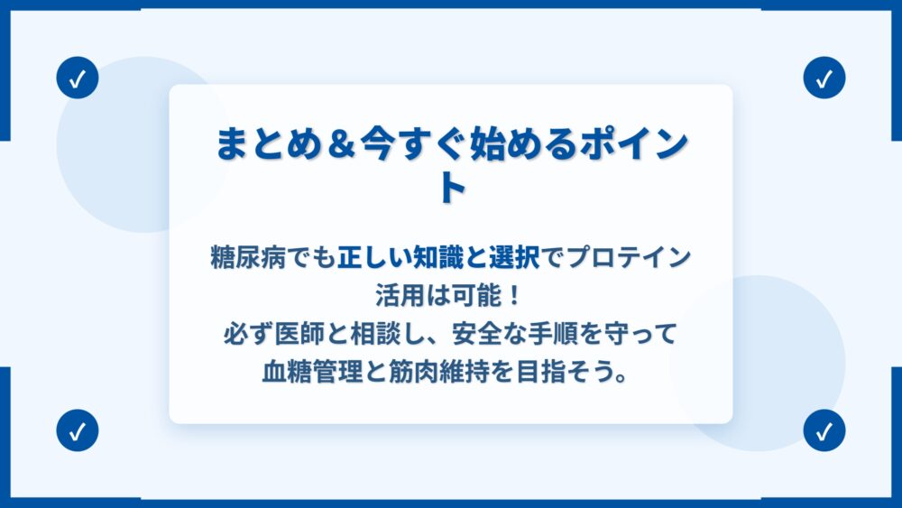 【結論】糖尿病でもホエイプロテインは条件付きで推奨される可能性があります。食前15g摂取で食後血糖値抑制の研究があり、筋肉維持にも有用です。いつ飲むかと選び方(WPI・無添加重視)を要点解説します。