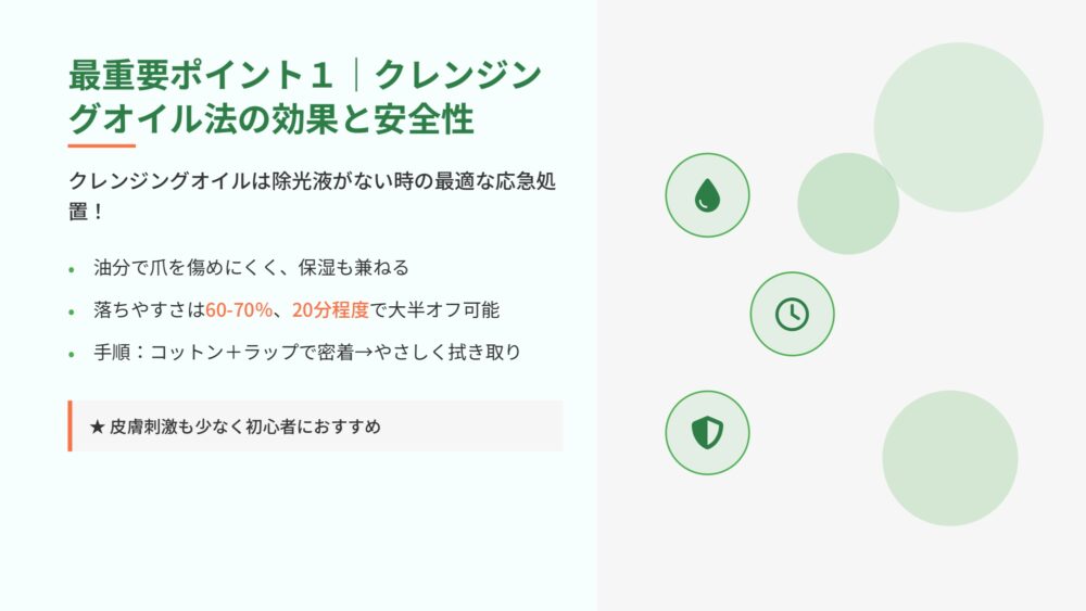 実際に私も除光液がない緊急時にクレンジングオイルを試してみたところ、20分程度で7-8割程度のネイルを落とすことができました。完璧ではありませんが、応急処置としては十分でした。