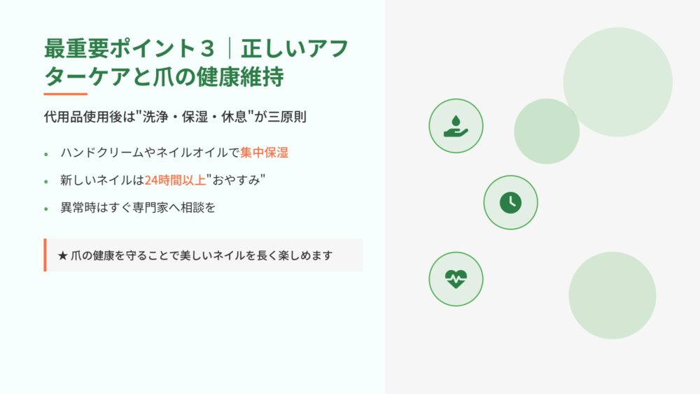 代用品使用後は、爪と皮膚が乾燥しやすくなっています。適切なケアで健康な状態を維持しましょう。
