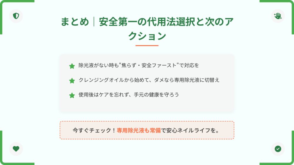 まず結論をお伝えしますね。安心してください、除光液の代用は思っているより安全にできます。