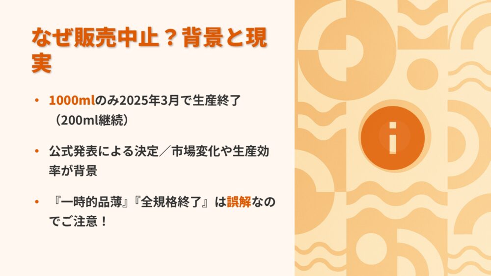 - 2025年3月に1000mlサイズが製造終了(公式発表・200mlは継続)
