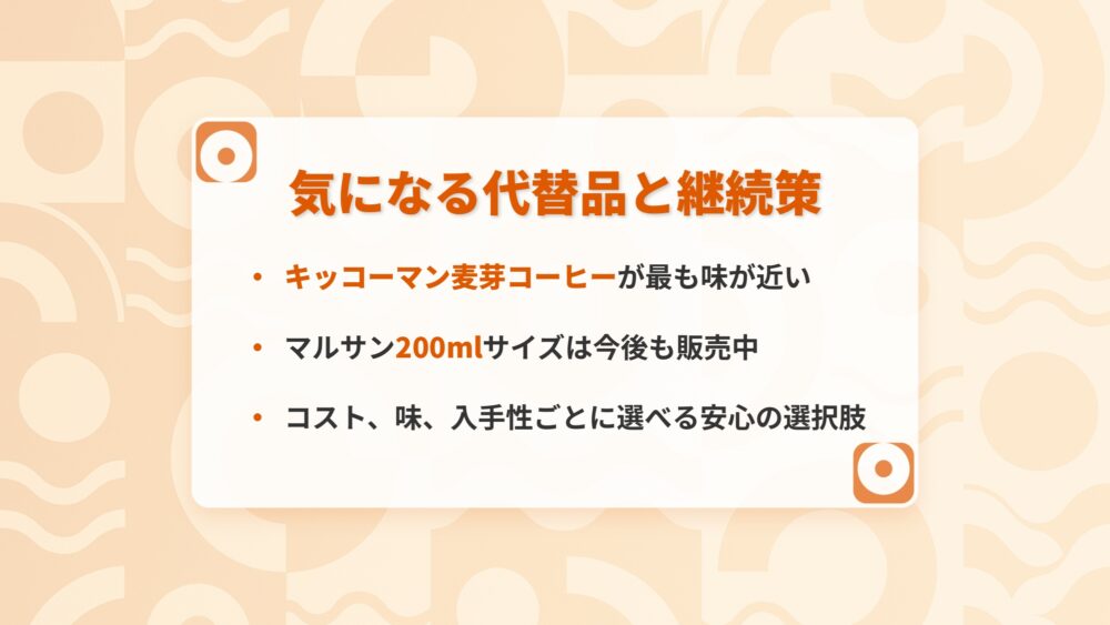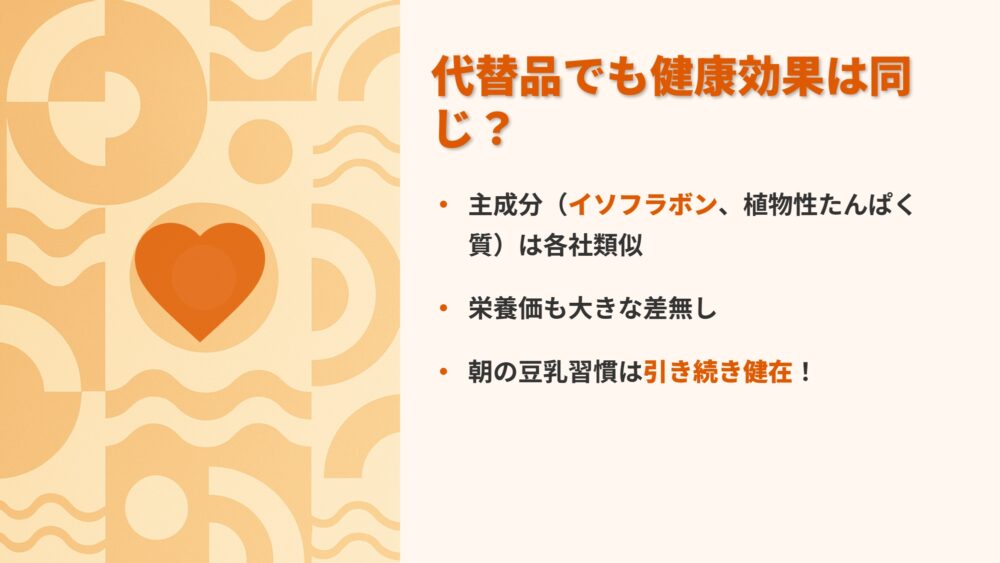 この結論はマルサンアイ公式発表に基づいています。実際に代替品を試した愛用者の多くが満足できる選択肢を見つけており、健康習慣の継続も十分可能です。
