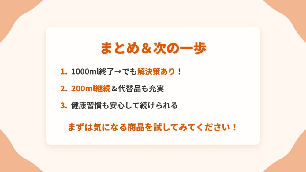 - コスト重視なら代替品、味重視なら200ml継続がお勧め