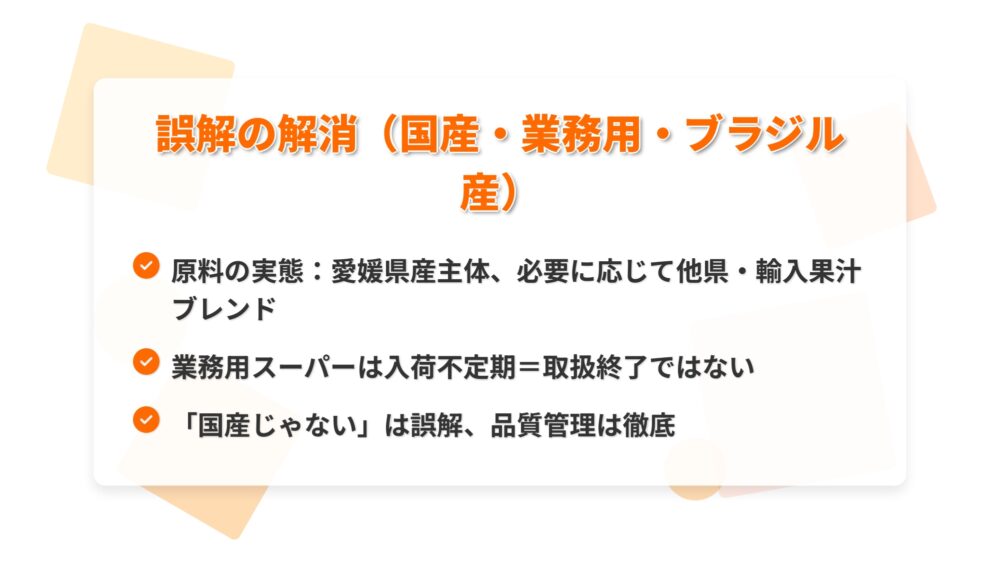 ポンジュースの原材料は「愛媛県産柑橘を主体とし、安定供給のため一部輸入果汁をブレンド」というのが正確な表現です。これは年間を通じて安定した味質と品質を保つための合理的な判断です。