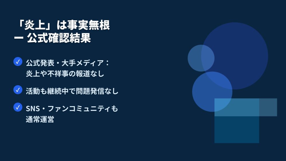 本記事でも同手順に基づき確認し、炎上に関する公式発表は「該当なし」という結果でした。