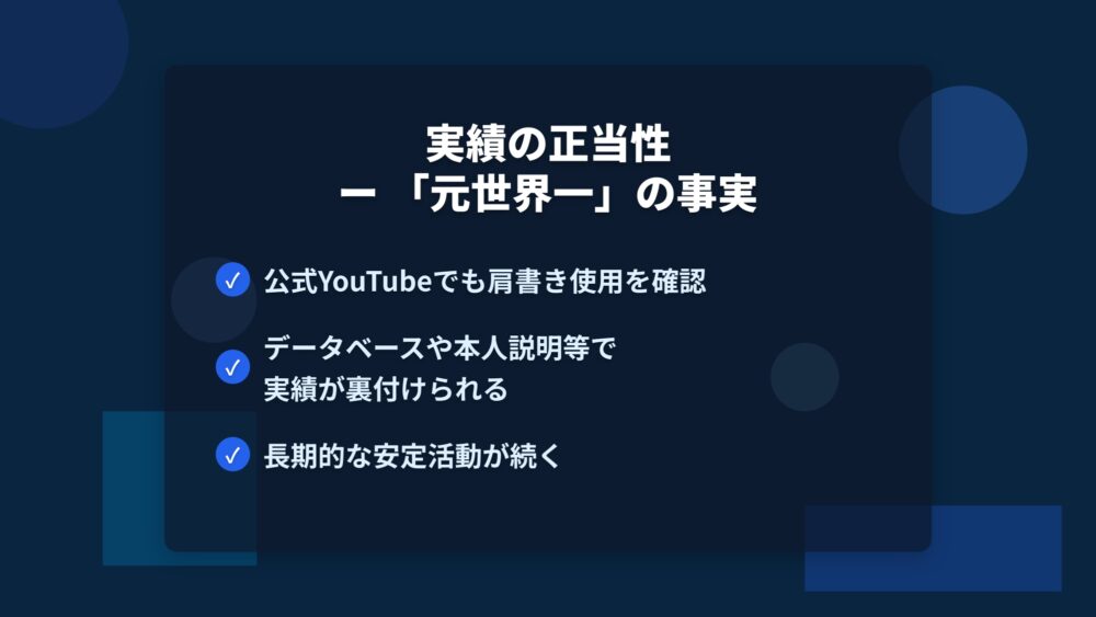 • 「元世界一」の表現は、公式チャンネル上での使用が客観的に確認できます