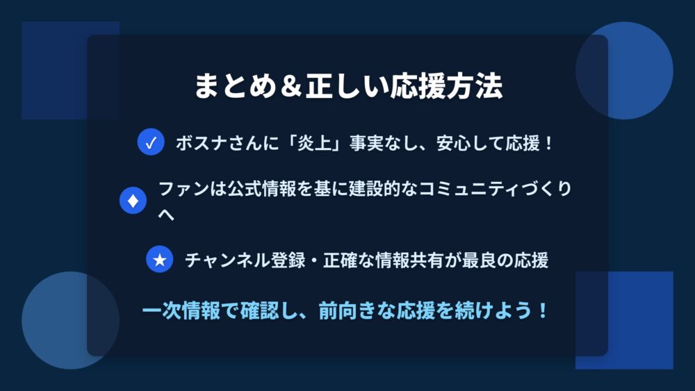 この記事では、ボスナさんの炎上事実の確認から元世界一の実績、現在の活動状況、そして正しい応援方法まで、公式情報に基づいて詳しく解説してきました。